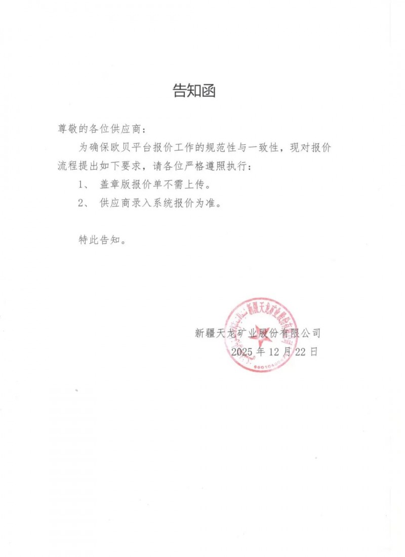 新疆天龙矿业股份有限公司致供应商的《告知函》
