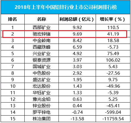 2018年上半年,驰宏锌锗在铅锌行业利润总额排名第二,实现利润额9.69亿元,同比增长41.19%。