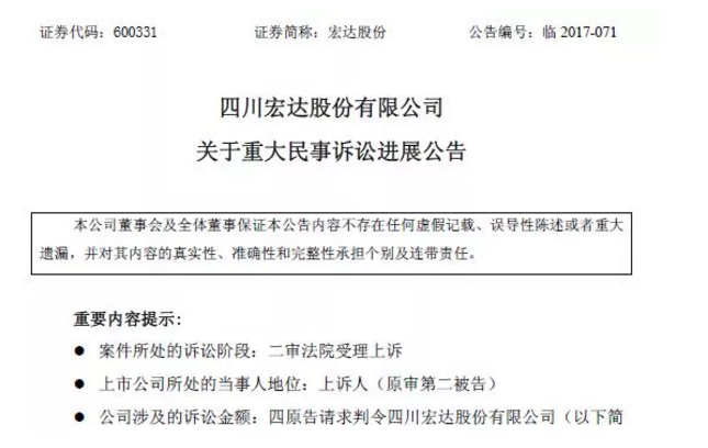2017年10月10日,宏达股份就该判决上诉至最高人民法院,请求最高人民法院依法撤销该一审判决。在2018年中报内,宏达股份表示,最高人民法院二审已于2018年1月5日开庭。截至2018年年中报告披露日,一审判决尚未生效,二审尚在审理过程中,二审结果尚存在重大不确定性。
