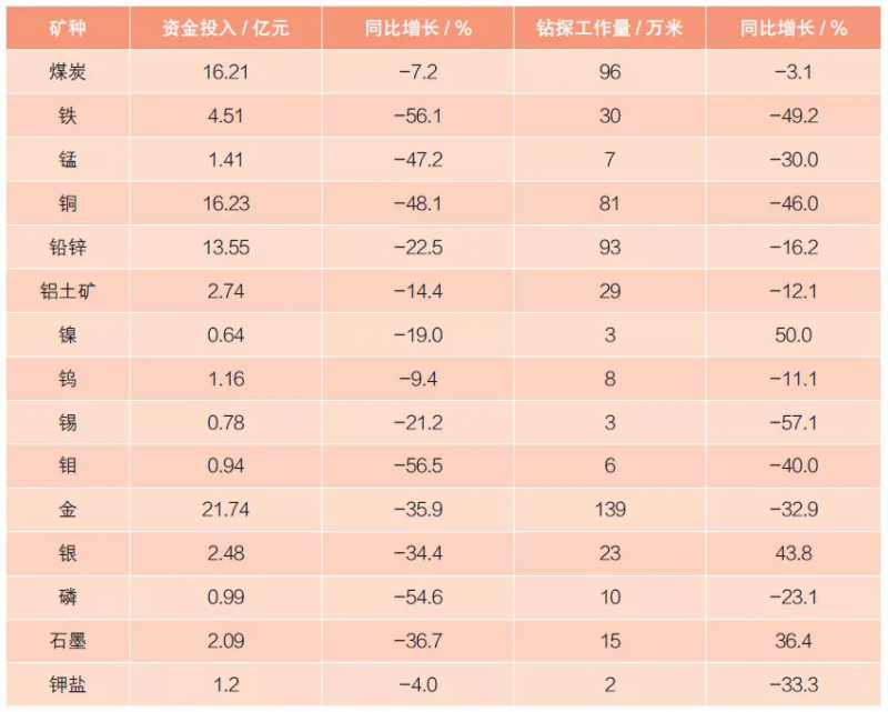 除了石油、天然气等,各个矿种的勘查投入几乎是全线下滑,某些矿种的勘查投入甚至减少了一半。