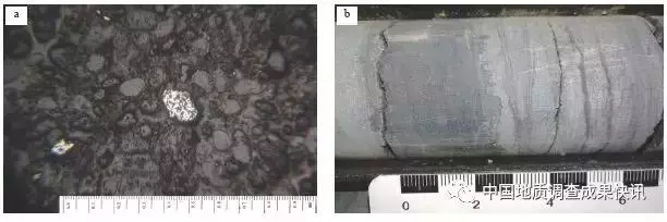 a—磷矿镜下显微特征;b—条带状磷矿岩岩心特征