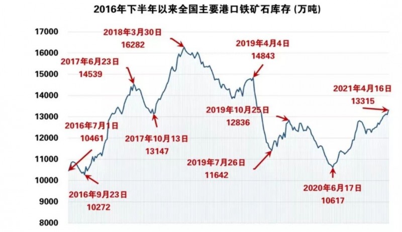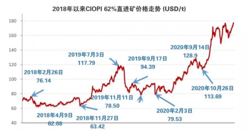 2021年开年铁矿石价格持续走高,让2020年飙涨的铁矿石价格更上层楼。2021年4月19日,进口62%粉矿到岸价价格为177.61美元/吨,环比每吨上升1.22美元, 升幅为0.69%,目前价格已接近历史最高点178点,并直奔180美元的关口买进,并有进一步突破200美元关口的趋势。