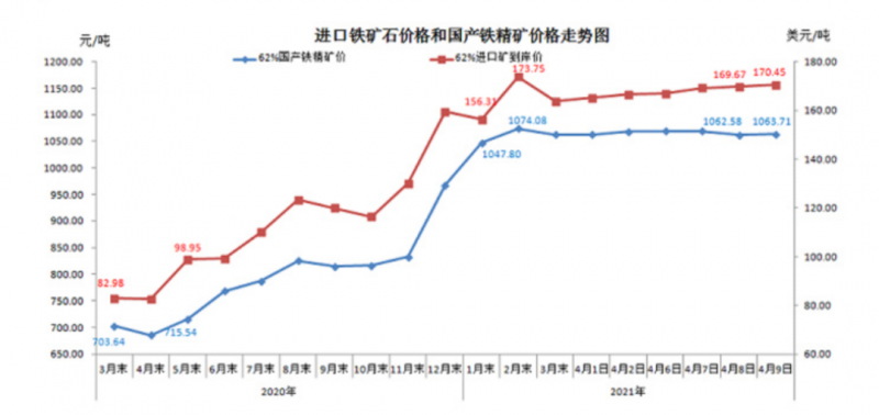 据最新数据显示,今年前两个月我国铁矿石的进口1.815亿吨,同比增长了2.8%,这也侧面显示了国内的消费市场的需求强大。4月9日,进口62%粉矿到岸价价格170.45美元/吨,环比每吨上升0.77美元,升幅为0.45%,当月平均价格为167.37美元/吨,维持高位运行,接近2月末最高水平。