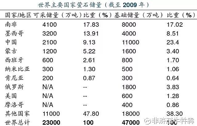 据美国地质调查局统计(USGS),预计全球确定萤石资源约含5亿吨,查明的储量约2.7亿吨矿物量。目前,萤石储量位列世界前四分别为南非、中国、墨西哥与蒙古,共计约占全球总量的50.4%。其中,中国萤石储量与南非并列第一,均达到4100万吨,占世界总储量15.19%。而作为主要萤石消费国的美国和西欧等萤石资源已经枯竭。