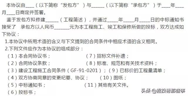 合同协议条款内容,依据《合同条件》结合具体工程情况,涉及招标单位的条款,在招标文件中提出;涉及投标单位的条款在投标文件中进行响应。本合同协议条款是模拟提示性的,招标单位应结合工程实际情况制订具体内容。
