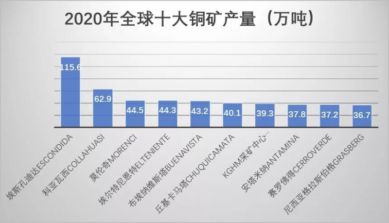 据海外网站Kitco统计,2020年全球前十大铜矿产铜501.6万吨,其产量约占全球总产量25%,较去年增加3各百分点,全球铜矿供应愈加集中。其中,智利埃斯孔迪达Escondida铜矿产铜115.6万吨,是全球最大的在产铜矿,也是全球唯一一个产量超过百万吨的铜矿,该矿铜产量约为全球铜产量的6%。该矿1990年开放,由必和必拓(57.5%)控股和管理,力拓(30%)和Japan Escondida公司(12.5%)为其他共同所有者。