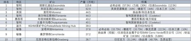 从2020年全球前十大铜矿的权益来看,全球前十大铜矿几乎被智利国家铜业公司、嘉能可、必和必拓、自由港和日本财团瓜分完毕。 智利国家铜业公司拥有排名4的ElTeniente铜矿和排名6的Chuquicamata铜矿;嘉能可拥有排名2的Collahuasi铜矿44%权益和排名8的Antamina33.75%权益;必和必拓拥有全球最大铜矿Escondida铜矿(57.5%)和排名第8的Antamina铜矿(33.75%);自由港拥有排名第3的Morenci铜矿、排名第9的CerroVerde铜矿和排名第10的Grasberg铜矿。值得注意的是,全球前十大铜矿里,日本财阀参股5座,分别是:排名第1的埃斯孔迪达Escondida铜矿(12.5%权益); 排名第2的科亚瓦西Collahuasi铜矿(12%权益);排名第8的安塔米纳Antamina铜矿(10%权益); 排名第9的赛罗佛得CerroVerde铜矿(21%权益)。 中国无铜矿上榜,其中五矿资源旗下的秘鲁Las Bambas铜矿在2019年度以38.3万吨的产能排名全球第8,也是唯一一座入选全球前十的中资铜矿。但2020年度,受当地环保人士堵路阻挠,铜矿运输通道受阻,退出全球前十。2021年底,Las Bambas铜矿关停,让人唏嘘。 未来,紫金矿业的卡莫阿铜矿、巨龙铜矿与五矿资源的Las Bambas铜矿,三驾马车护航,中国铜资源的定价能力将大幅提高。