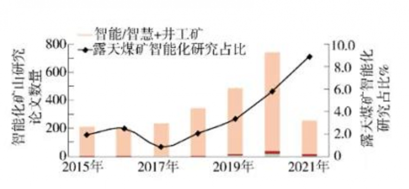 自2015年以来,露天煤矿智能化研究呈上升趋势,特别是2020年“指导意见”前后,相关研究数量呈激增状态,露天煤矿研究占比整个煤炭行业智能化研究呈逐年上升趋势。目前,露天矿山智能化发展主要体现在初期智能化管控平台的建设、智能化设计、智能化工艺及设备等方面,尤其侧重于无人驾驶、卡调系统等研究。