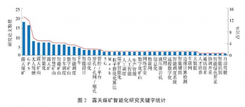 对露天煤矿智能化建设方面关键字大致集中于GPS、无人驾驶、智能矿山、卡车调度、智能设计、数字矿山、管控平台、钻孔、自动化、5G、网络安全、大数据、自动驾驶等,分布较广但数量不多。露天煤矿智能化研究关键字统计如图2。