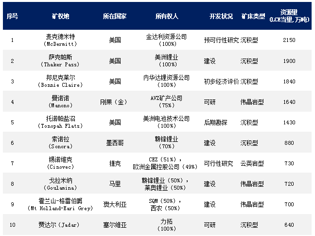 根据总资源量(LCE,碳酸锂当量,万吨,以下同),Mining Intelligence网站列出了世界前十大粘土和硬岩锂矿。