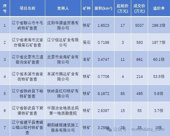 高溢价(10-100倍):共3宗,包括凌海市萤石矿(约197倍)、本溪市曲家街铁矿(53.5倍)、北票市金矿(约60倍),反映萤石、金矿及特定区域铁矿仍是市场追逐热点;