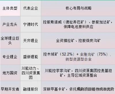 锂电产业链龙头(宁德时代、天齐锂业)、专业锂企(盛新锂能、融捷股份)及地方国资(四川自然资源集团)为开发主力,通过控股/参股整合资源,推动规模化、集约化开发。