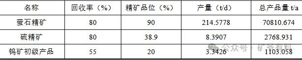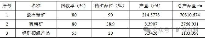 •产品:萤石精矿70810.674t/a、硫精矿2768.931t/a、钨矿初级产品1103.058t/a