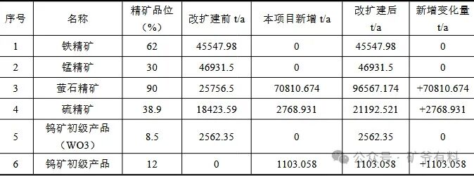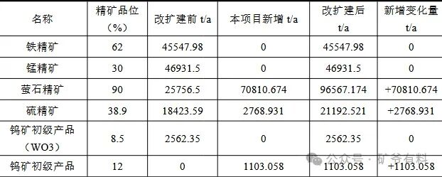 •产品:铁精矿45547.98t/a、锰精矿46931.5t/a、萤石精矿25756.5t/a、硫精矿18423.59t/a、钨矿初级产品(WO₃)2562.35t/a