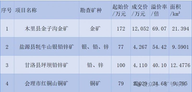 多金属矿种备受青睐:盐源县牦牛山(银、铅、锌)和甘洛县坪坝(铅、锌)两个多金属矿项目溢价率分别达到5542%和4010%,成交价均超过4000万元,表明兼具贵金属(银)和重要工业金属(铅、锌)的综合性矿床具有很高的勘查价值。