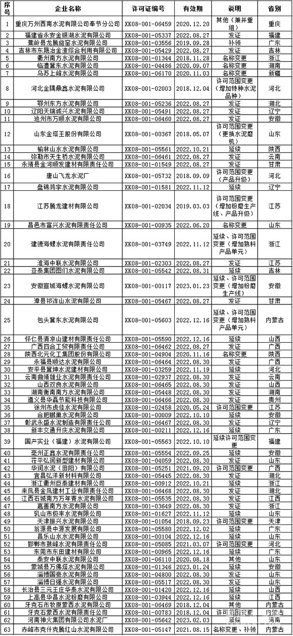 国家质检总局最新公布获得水泥生产许可的63家企业